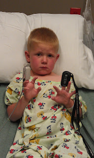 This is Trevor in the ER after they told us he'd be admitted and they hooked him up to his IV and oxygen.Sad scared little boy.